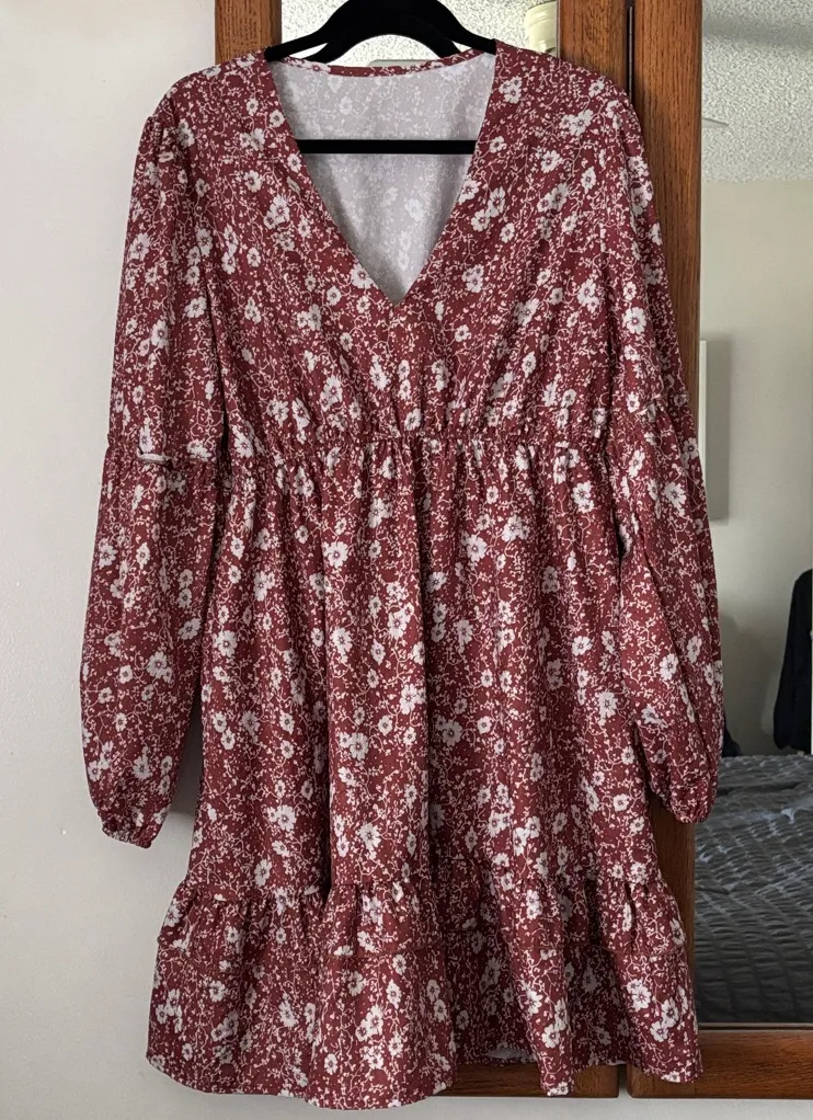 Chic floral dress with a V-neck and long sleeves. Perfect for any occasion. I can’t think of a more perfect fall dress for photo shoots. pit pit measures roughly 21 inches across so I’m guessing it’s a size large elastic around the wrists, medium balloon sleeves elastic around the waist, ruffle hem flattering V-neck. Pair this with some boots and a hat maybe even a scarf and it would be so cute for photo shoots . Top to bottom measures roughly 34 1/2 inches. 100% polyester. Runs small more like a xl