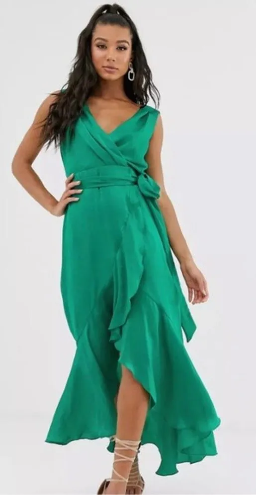 Green wrap high-low dress. Ruffled detail. Removable matching belt. 100% polyester - soft satin like material. Great preloved condition - one small black blemish on chest. Size 8 21" pit to pit, 58" long in back