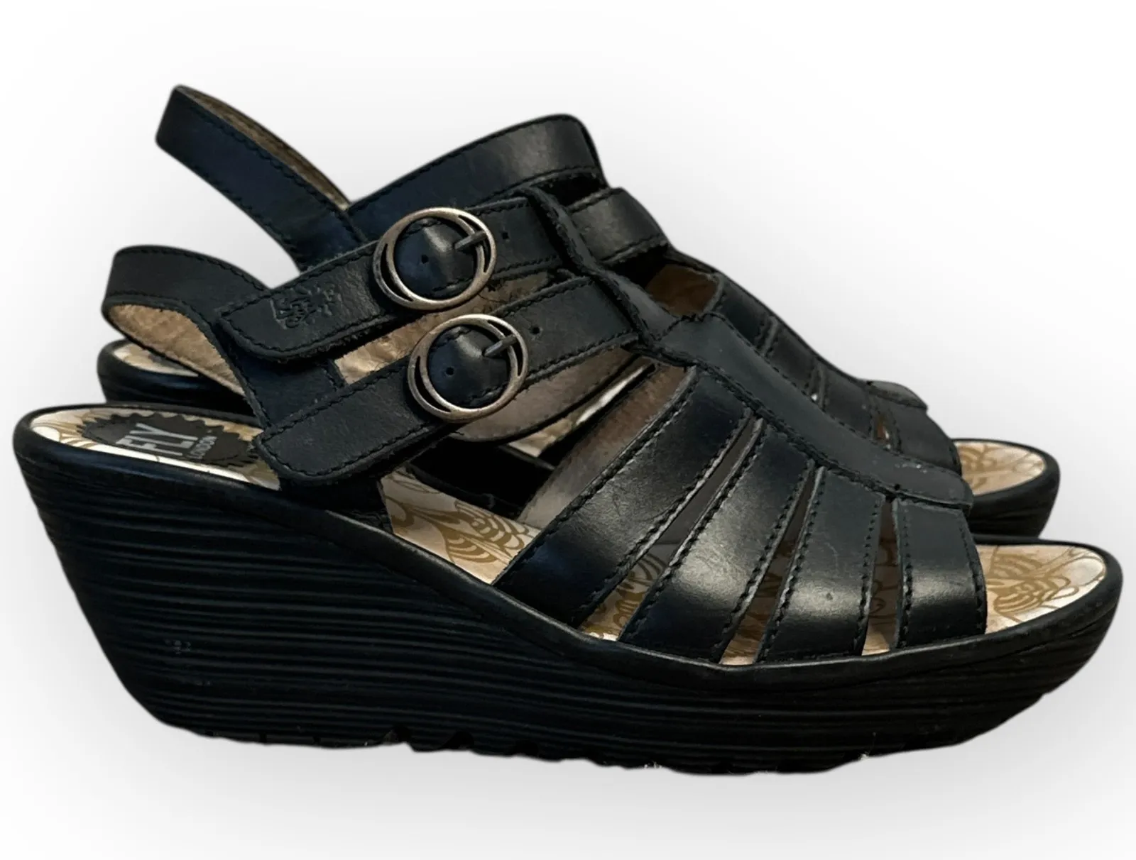 FLY LONDON Ygor Wedge Gladiator Heeled Sandal Size 8 39 Black Strappy Chunky - $50 - From Therese