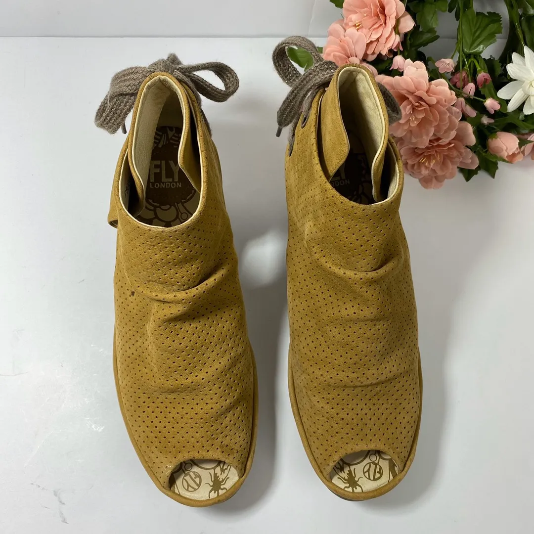 Like new condition. Mustard/yellow color Fly London Peep Toe Wedges. ** Last picture for comparison purpose and for full description see #7 picture** Right shoe has a tiny black mark on the outside see picture #5 (zoom picture). Otherwise no signs of wear. **Size: 39** Clean in & out. No rips or stain! S49 Feel free to ask questions. No trades or modeling. Sorry! ALL MEASUREMENTS ARE APPROXIMATE. REASONABLE OFFERS & Bundles for a great deal are Welcome! Same day o