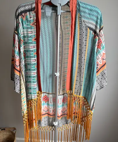 Stylish kimono with coral and aqua patterns. Perfect for a chic look. No flaws.