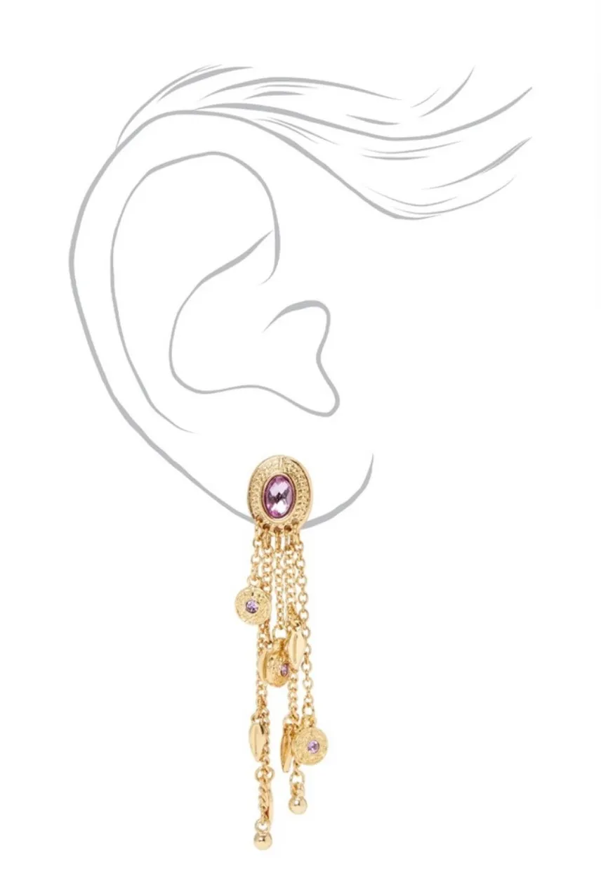 These stunning gold dangle earrings feature four chains hanging from each earring and purple rhinest... Show more