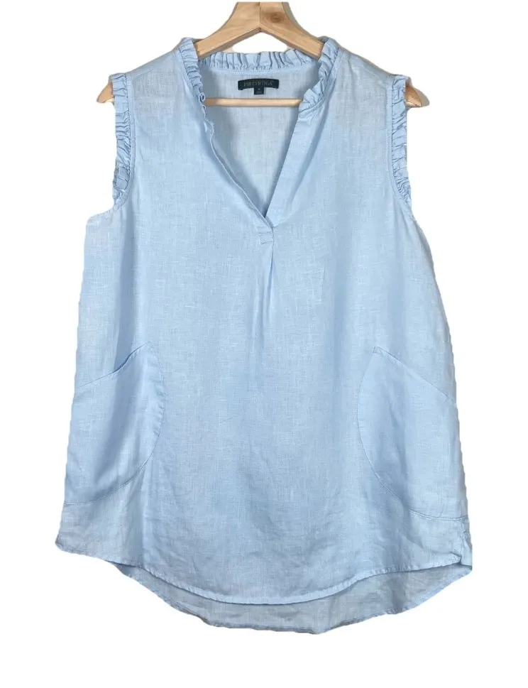 The For Cynthia Baby Blue 100% Linen Tunic Top is a stylish and versatile addition to any woman's wardrobe. This sleeveless blouse features a V-neckline and ruffle trim, adding a touch of feminine flair. Made from breathable linen fabric, it is perfect for casual occasions during the warmer seasons. The pullover closure and regular fit make it easy to wear, while the solid blue color and beachy theme add a playful touch. Pair it with your favorite bottoms for a relaxed yet chic look.