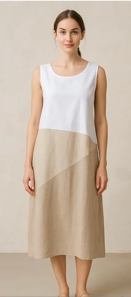 NWT For Cynthia Sleeveless Linen Blend Shift Midi Dress Sz XL Pockets A-line No flaws or signs of wear Beautiful classic colorblock dress Cream, Oatmeal, Beige. Linen Viscose blend. Sleeveless Scoop neck Darts A-line On seam pockets