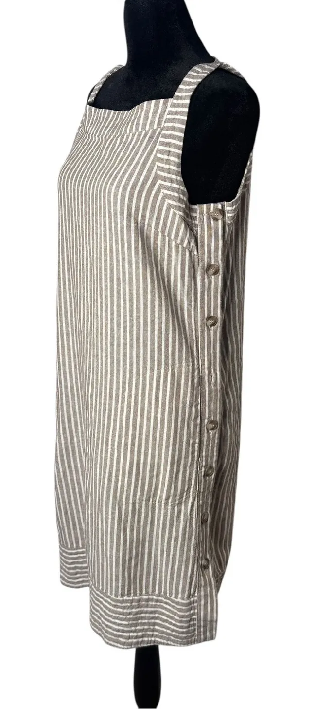 FOR CYNTHIA Striped Dress Size S Linen Blend Minimalist Coastal Resortwear Cut Out Back Has Hand Pockets Linen Blend Sleeveless Earthy Pre Owned, In Excellent Shape No Holes, Stains or Fading ****Measurements are Located in Photos Pet Free Smoke Free