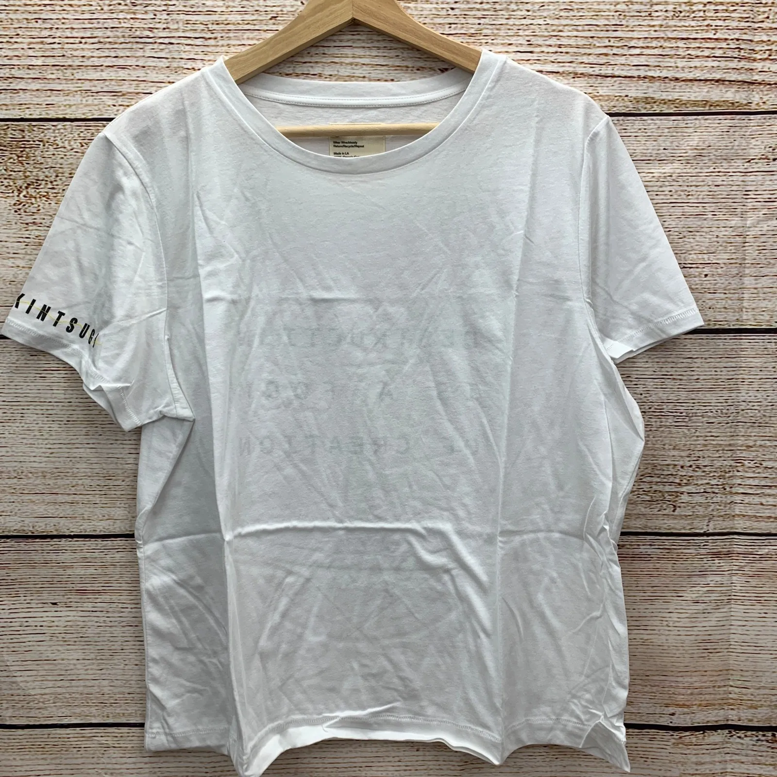 The back of the shirt features the text "DESTRUCTION IS A FORM OF CREATION" in black block letters, and the left sleeve displays the word "KINTSUGI" with a yellow accent line. This shirt is made from 100% organic cotton and is designed for everyday wear. Made in USA Type: T-Shirt Department: Women Style: Basic Material: 100% Organic Cotton, Organic Cotton, Cotton Neckline: Crew Neck Sleeve Length: Short Sleeve Sleeve Type: Classic/Fitted Sleeve Pattern: Solid Features: Breathable, Lightweight, Stretch Fit: Regular Keywords: FOR DAYS T-Shirt, Organic Cotton Tee, Graphic T-Shirt, Destruction is a Form of Creation, Kintsugi, White T-Shirt, XXL T-Shirt, Crewneck Shirt, Sustainable Fashion, Ethical Clothing, Made in LA, Comfortable Tee, Casual Wear, Everyday Shirt Please look at pictures closely for condition.