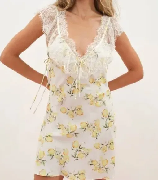 Charming For Love and Lemons Audrey Mini Slip dress with floral design. Features delicate lace accen... Show more