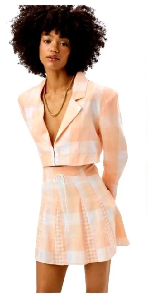 This chic For Love & Lemons Eugenie Cropped Blazer in eye-catching tangerine color is the perfect addition to any stylish woman's wardrobe. Cut in a medium size, it's windowpane, checked pattern gives it a classic, timeless appeal.