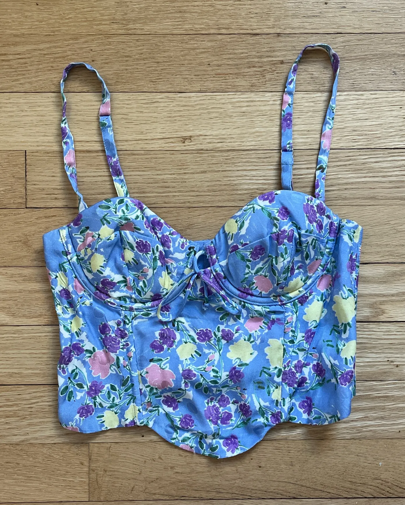 - blue/purple - floral and polka dot - size xs - adjustable straps - corset - has some ripping and... Show more