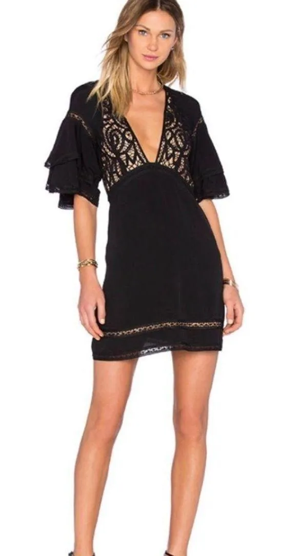 Worn but still in great condition. Super chic Lacey mini dress. Fluttery sleeves with lace detailing... Show more