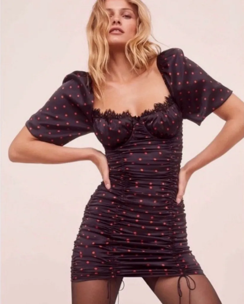 For Love and Lemons Melrose Polka Dot Dress Black Red Ruched Satin Blogger Fav Size XS Great cond... Show more