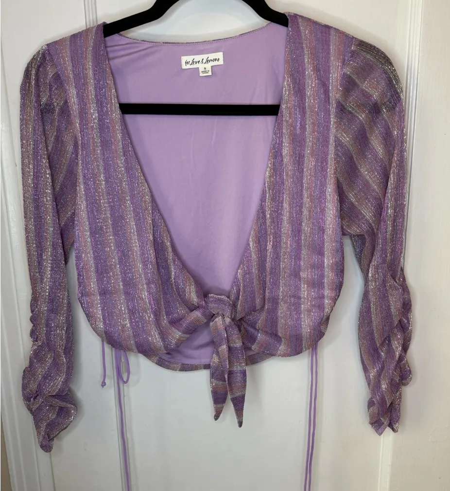 Chic lilac blouse featuring sparkling metallic stripes accents. Perfect for a stylish look. Ties in... Show more