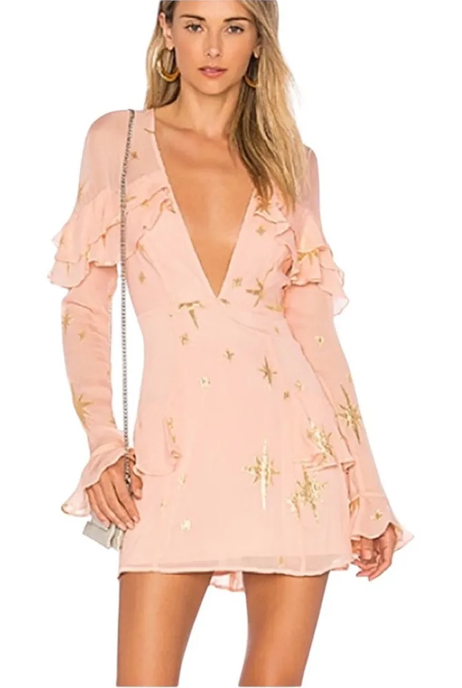 For Love And Lemons Silk Gilded Star Mini Dress Size M Excellent pre owned condition Peach with Go... Show more