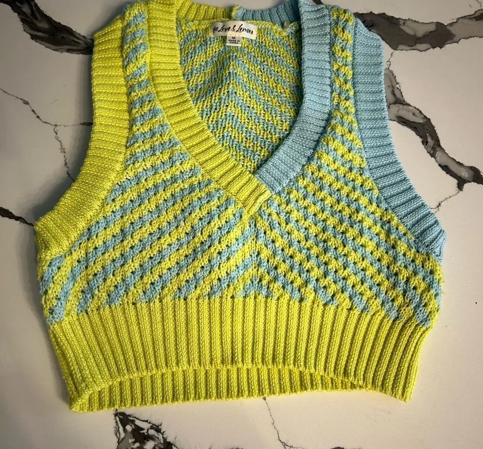 Vibrant knit cropped vest in yellow and blue. Perfect for layering.