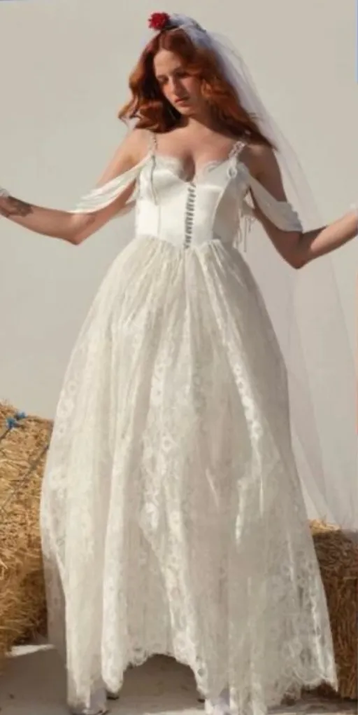 Elegant white lace wedding dress. Features delicate lace details and button accents. Perfect for a r... Show more