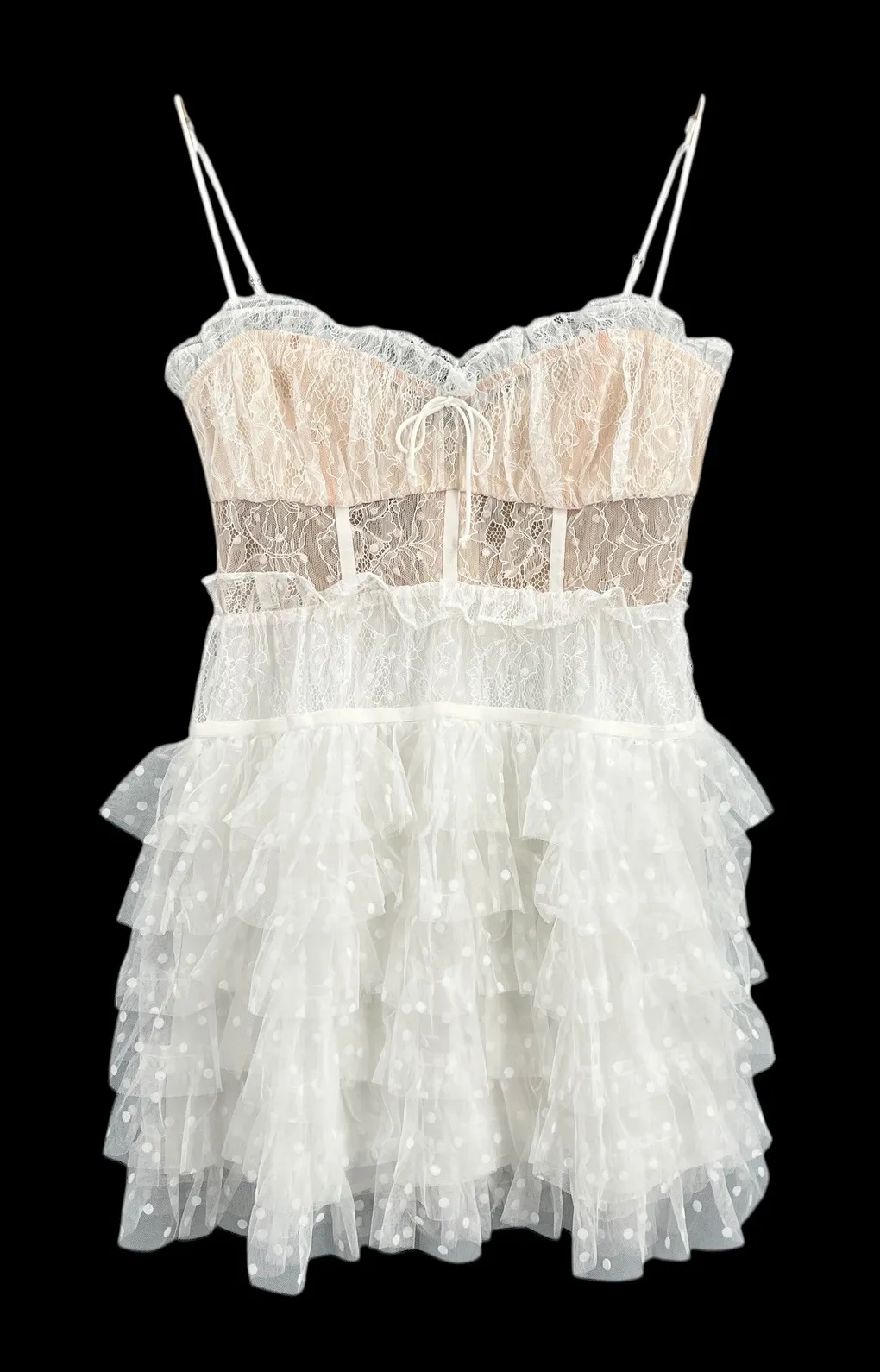 For Love & Lemons Lace Corset Tiered Ruffle White Mini Dress Size M New Brand new with tags attached, this stunning mini dress by For Love & Lemons features a boned corset-style bodice with sheer lace overlay, a peek-through midsection, and a flirty polka-dot tulle tiered skirt. Lined at the cups for coverage; midriff and skirt remain unlined for a romantic layered effect. Measurements: Armpit to armpit: 17″. Waist: 14″. Length: 32″ (from strap to hem). Condition: New with tags — never worn. Keywords: For Love Lemons, lace dress, ruffle dress, dot dress, mini dress, romantic, feminine, evening, party, cocktail, sheer, tulle, corset