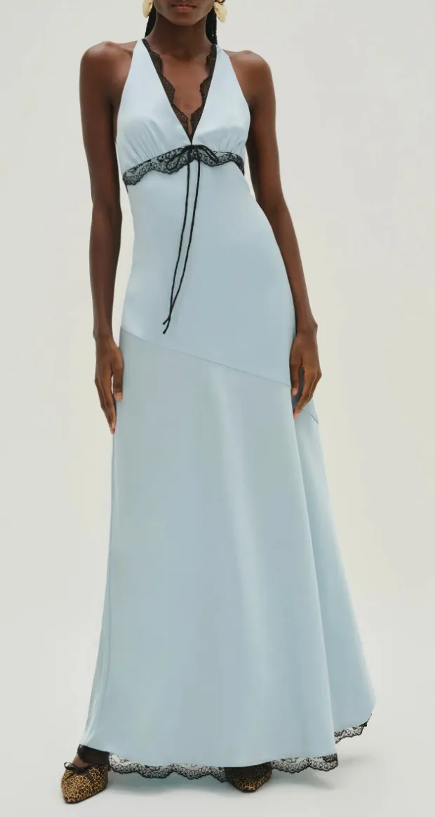 New without tags. Small mark from in store try on, will come out in a dry clean! 97% Polyester, 3% Spandex Imported Dry clean Unlined Non-stretch Maxi length Bias cut Adjustable straps V-neckline Contrast lace trim Low back Bow tie detail at chest Hidden back zip closure This product is true to size Manufacturer's style no. CD3615-HO24-BLUE