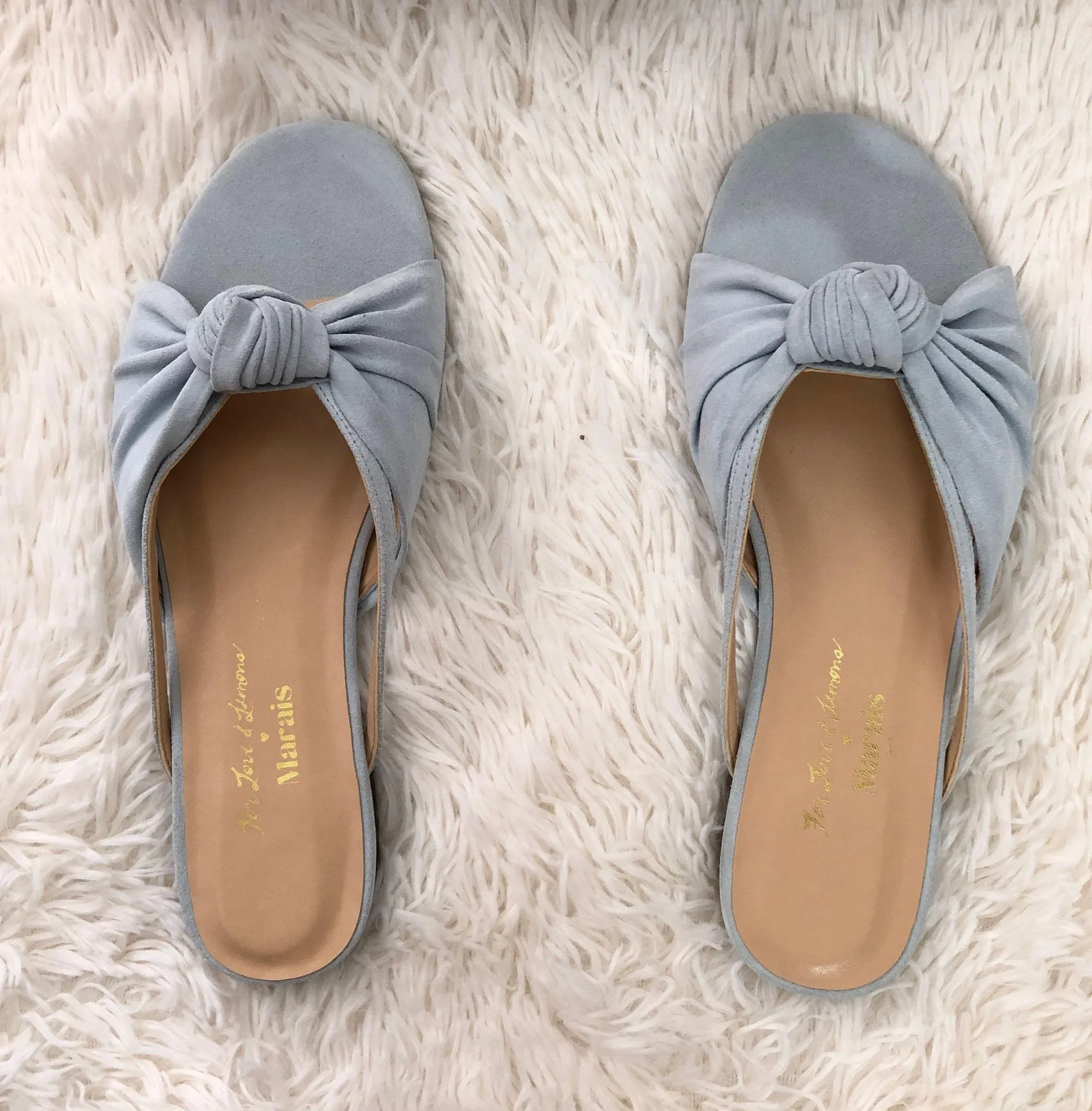 Size 8.5, runs 1.5 sizes small (best fits 6.5 - 7) -Baby blue suede strappy slide sandals with knott... Show more