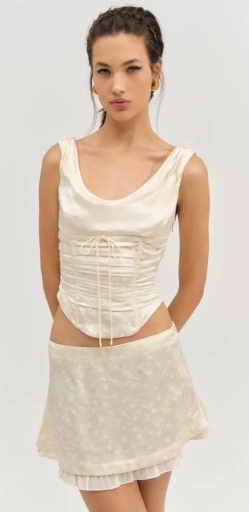 The Carla Jacquard cream mini skirt and corset top set is crafted in a sleek floral jacquard, perfec... Show more