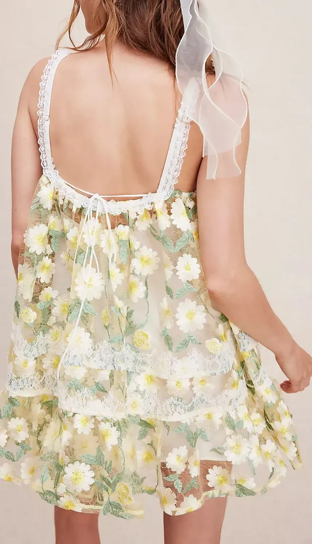 For Love & Lemons Rachel Mini Dress in Yellow Floral. Size Medium. Features lace-adorned square neck... Show more