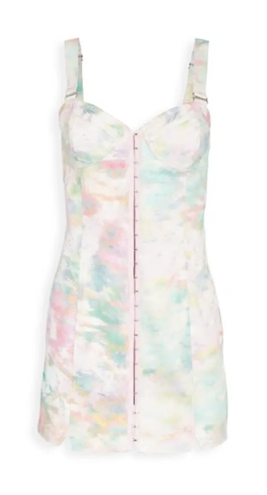 Good pre worn condition. For love and lemons smythe pastel tie dye denim corset dress size small.... Show more