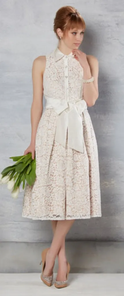 Shoulder to hem perfection is this amazing stunning chic trendy feminine allover lace dress fully lined in size 2. An instant closet masterpiece features hidden side zipper, full skirt, side pockets and satin cream belted tie.Front button closure right around waist. Buttons are beautiful cream pearls encircled by rhinestones. Collared satin neck detail. Measurements bust 16”…..shoulder to hem 39”