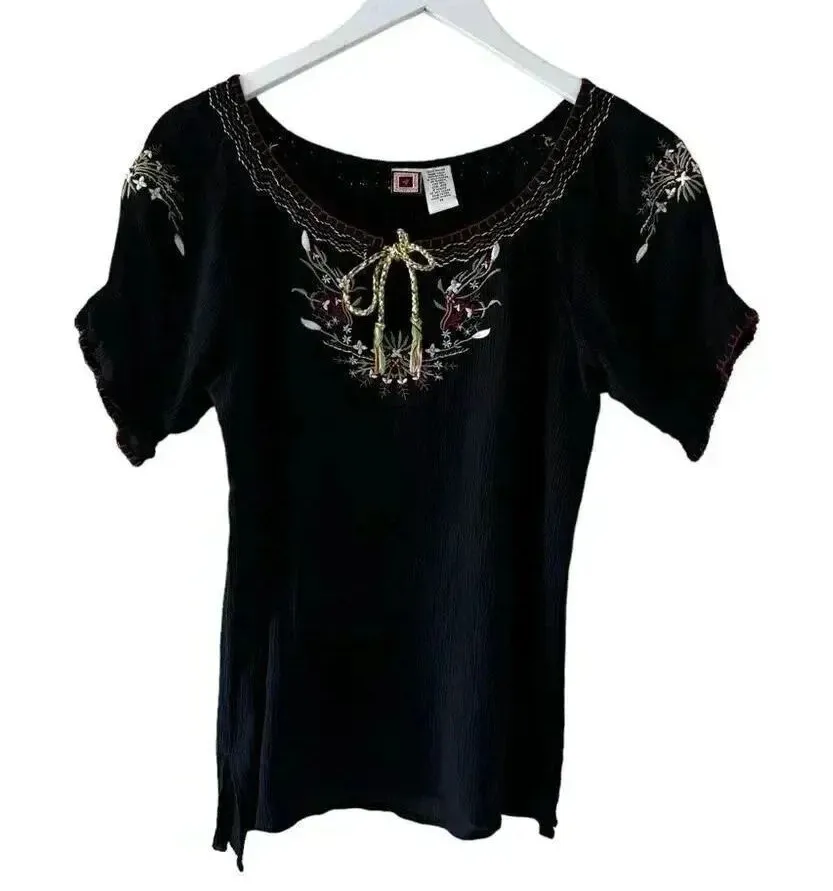 Forbidden Black Embroidered Floral Western Short Sleeves Bohemian Women’s Split Hem Blouse SZ M #221... Show more