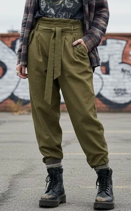 NWOT- NEW WITHOUT TAG! FORE olive green paper bag cargo pants elastic waist belt pockets SIZE: SMALL Approximate Measurements : WAIST: 14” RISE: 14” INSEAM: 27” Elevate your wardrobe with these versatile high-waisted paperbag pants in an olive military green. Featuring a flattering tapered fit and an adjustable self-tie belt, these trousers perfectly blend comfort with edge. Whether you're styling them for a grunge aesthetic with combat boots, a preppy look with a tucked-in blouse, or an elegant evening outfit with high heels, their silhouette offers a sophisticated yet relaxed vibe for any occasion. Tags: Grunge style , Army green women's trousers Preppy look , High waisted paperbag pants Elegant chic , Tapered military pants Streetwear , Olive green cargo trousers Aesthetic clothes , Tie-waist baggy pants Minimalist fashion , Women’s high rise casual pants Military trend , Utility style fashion Urban style , Street style outfit ideas Vintage vibe , Retro tapered trousers