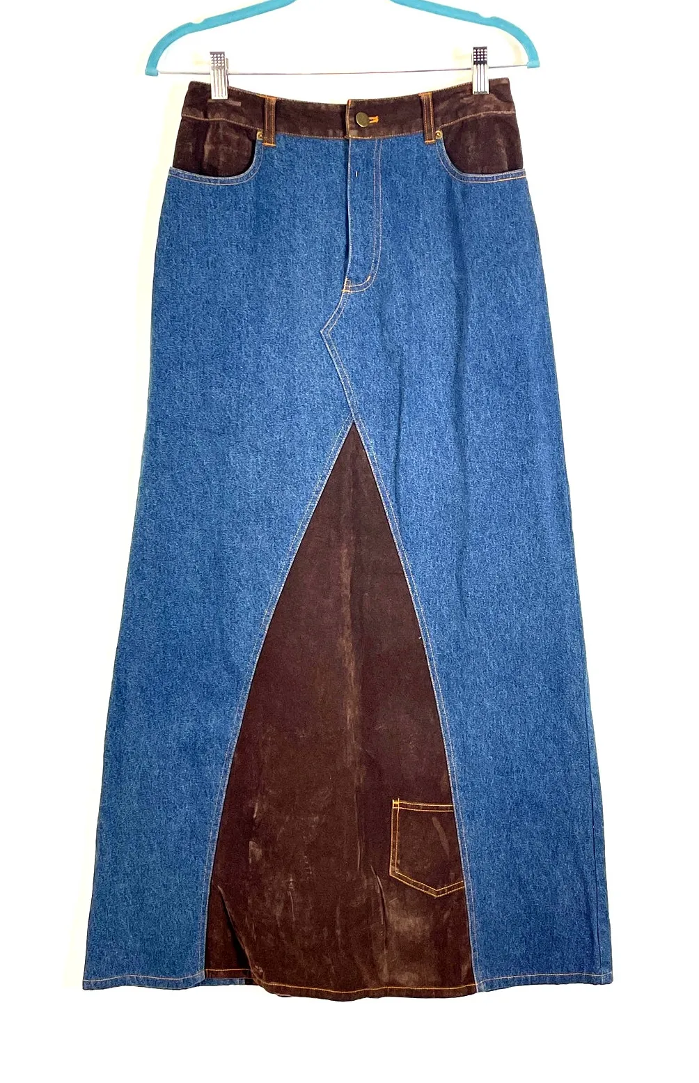 This Forenza skirt is in new condition and ready to wear! It features a unique combination of denim and faux suede, perfect for adding a touch of vintage charm to your wardrobe. The maxi length makes it versatile for various occasions. Size: 6 Color: Blue and Brown Style: Maxi Material: Denim and Faux Suede Condition: New without tags