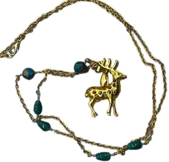 Forest God gold tone deer buck and Jade green beads stones cut out long necklace - $21 New With Tags - From Terra
