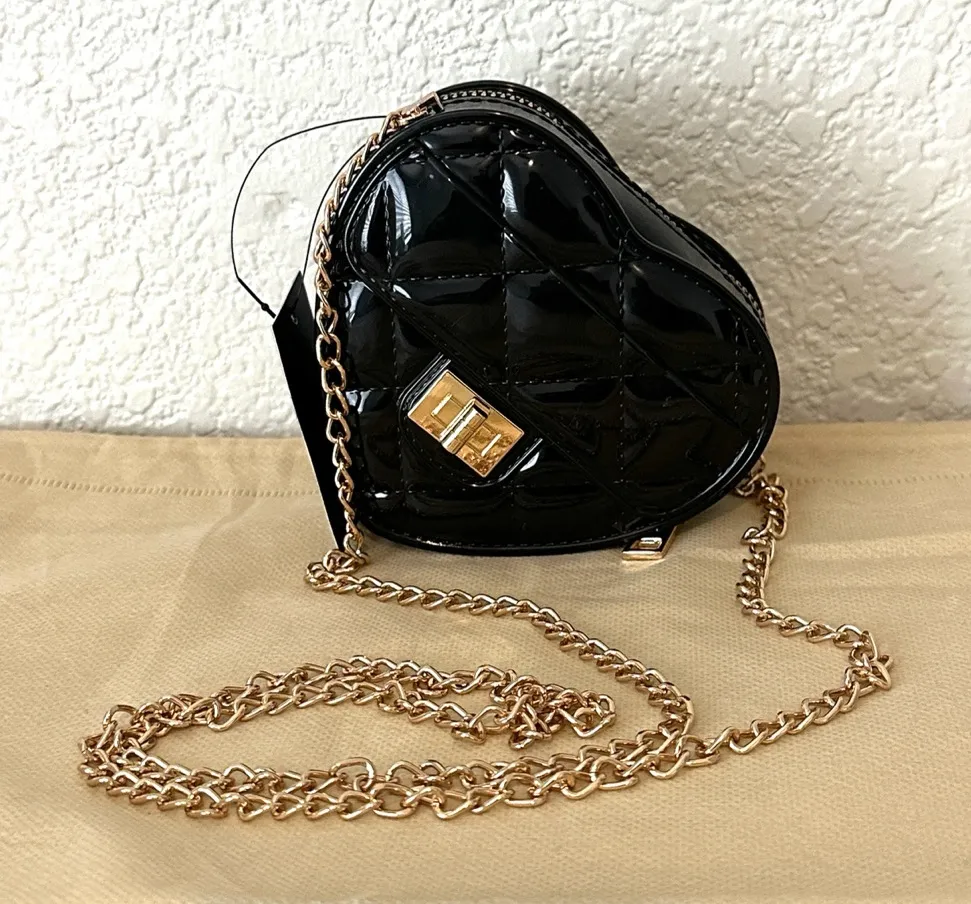 Chic and stylish black quilted heart-shaped crossbody bag. Perfect for adding a touch of elegance to... Show more