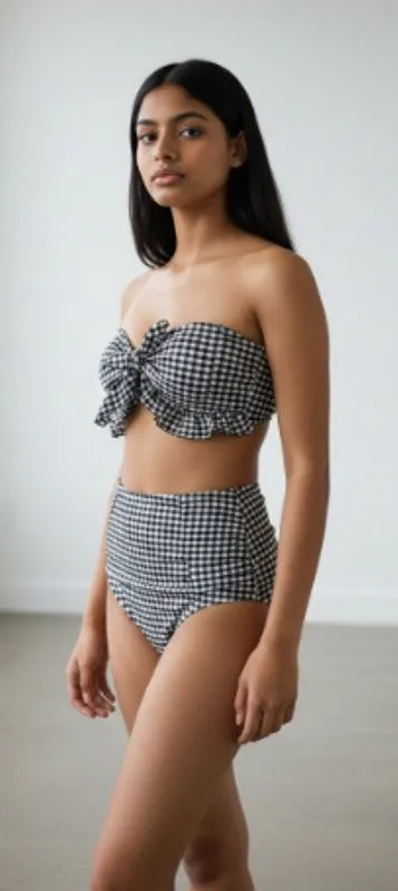 Forever 21 Check Retro High Waist Bikini Set -Classic Black White Check -Strapless Top -Ruffle -K... Show more
