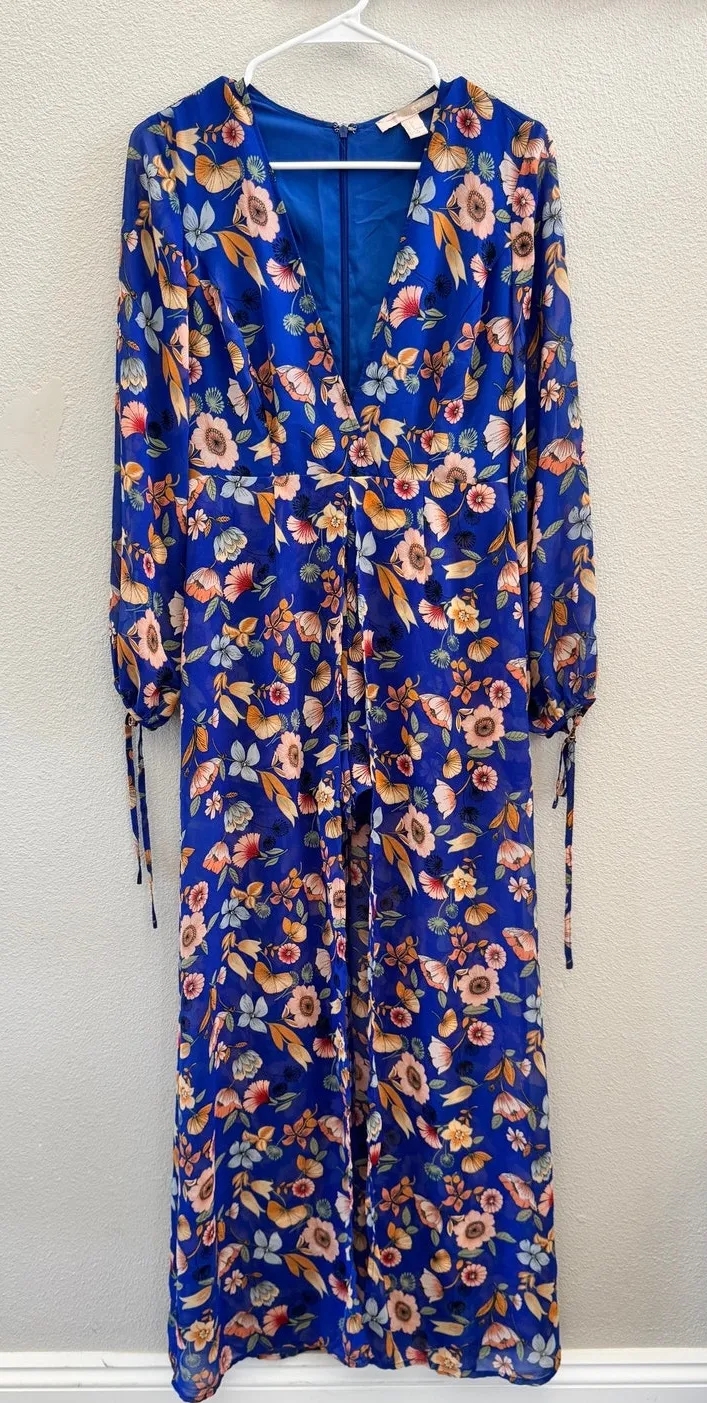 Discover the flirtiness of this Forever 21 Floral Maxi Dress, a delightful addition to any wardrobe. This blue romper dress, with long sleeves, v neck, and flower details, are perfect for vacation, date night or a relaxed brunch with friends