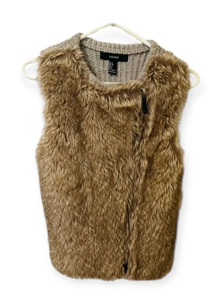 Stylish brown knit vest with soft faux fur detail on the front. Perfect for layering. Zipper and but... Show more