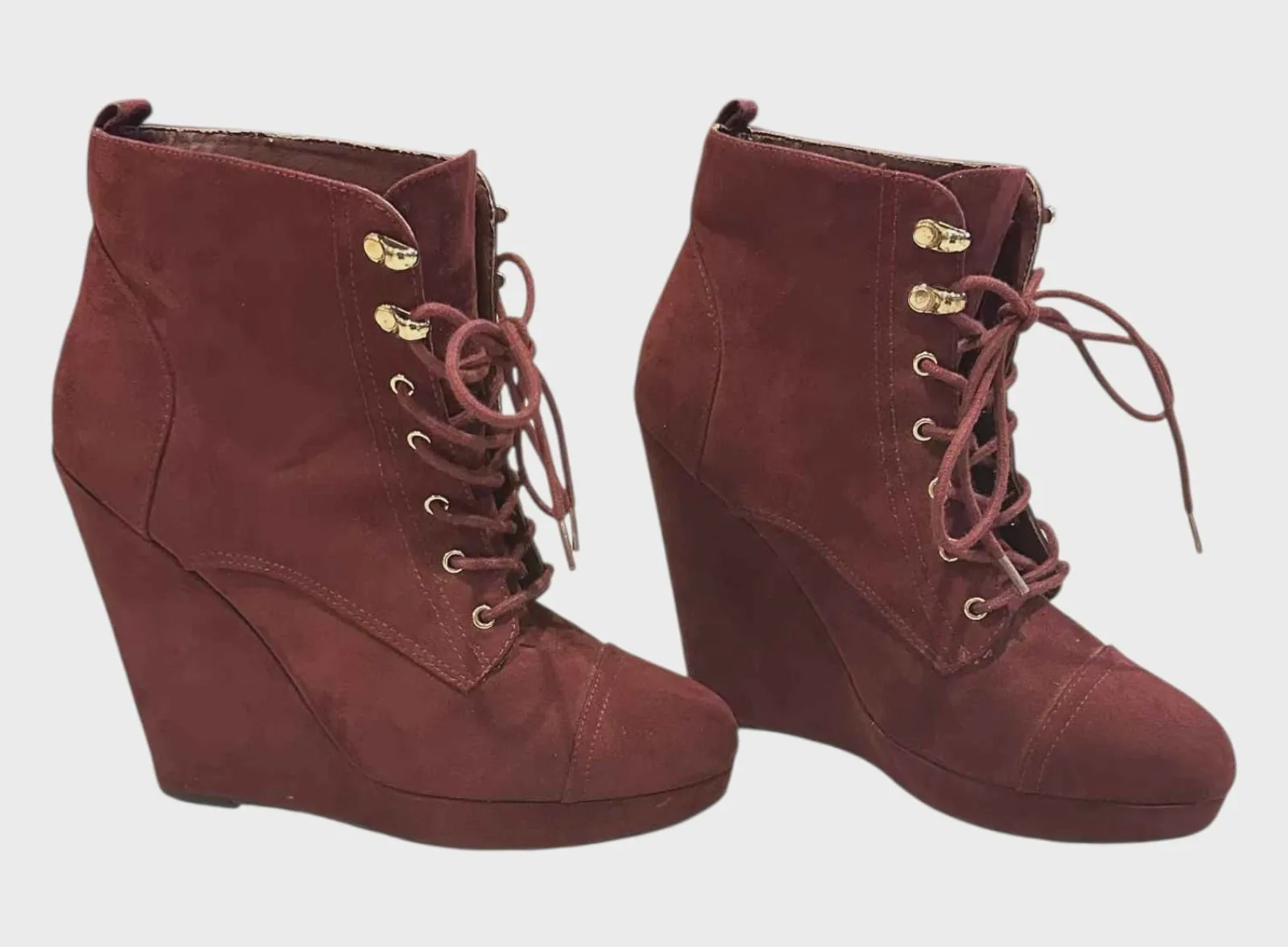 Color: Burgundy/Maroon Style: Wedge booties Closure: Lace-up front Hardware: Gold-toned eyelets Size... Show more