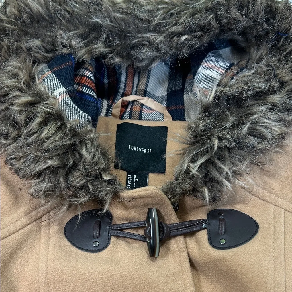 Chic camel coat featuring a faux fur trim. Toggle closure adds a classic touch. Ideal for cold weath... Show more