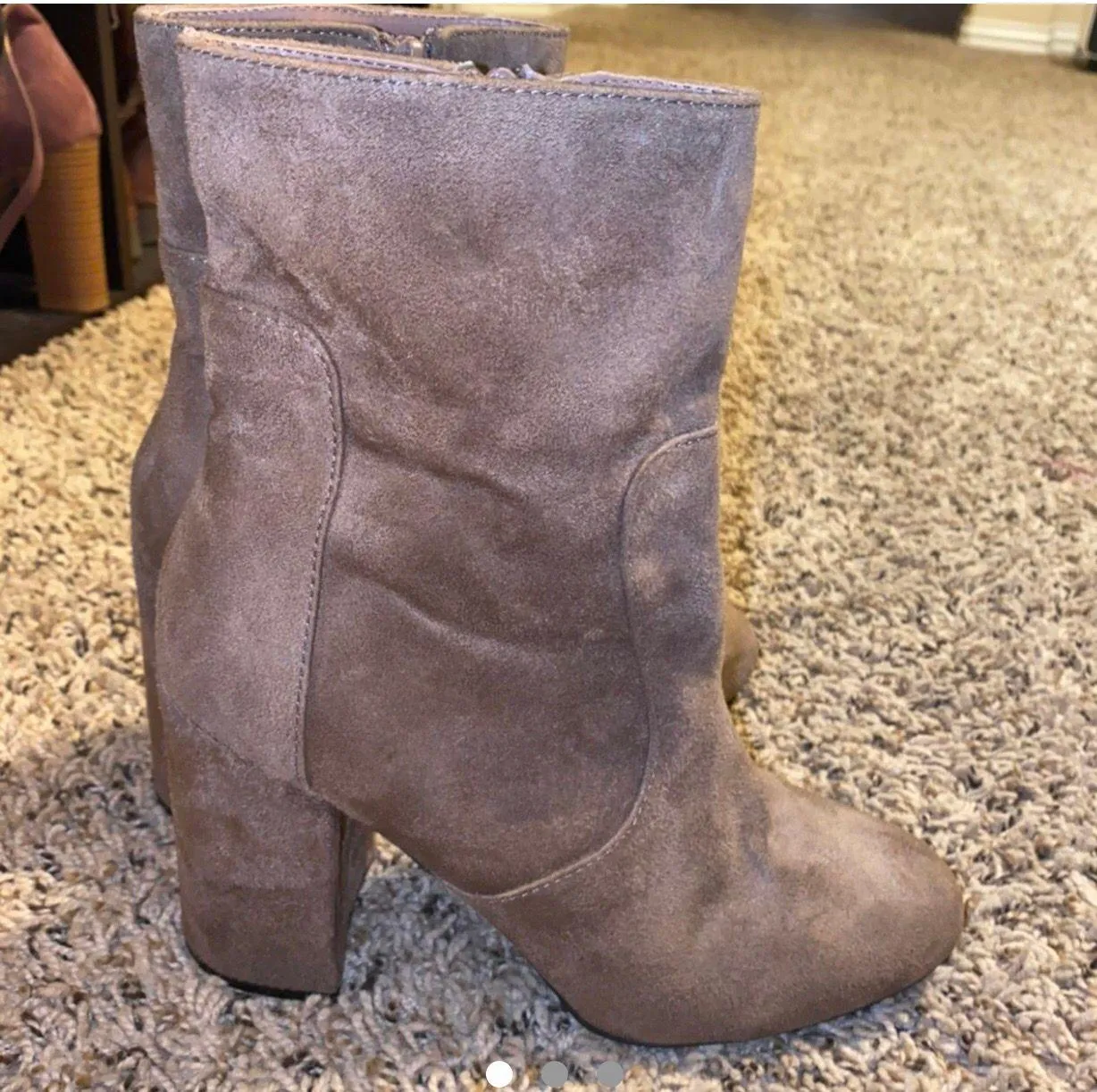Suede light brown/tan chunky heel booties. Have a chunky heel so they’re more comfy than the skinner... Show more