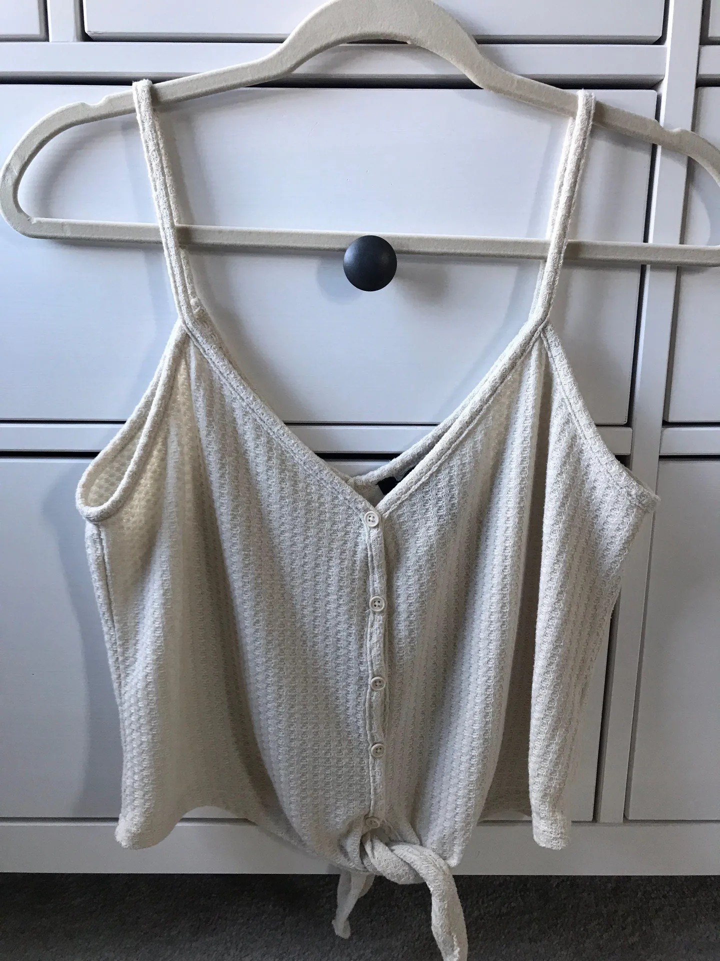 Cream colored crop top with a tie on the bottom from Forever 21, gently used, could fit as a large,... Show more