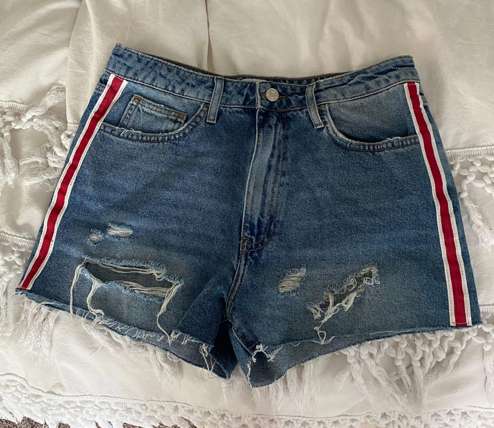 jean shorts in perfect condition! rips in the front and red/ white stripes down the sides! super com... Show more