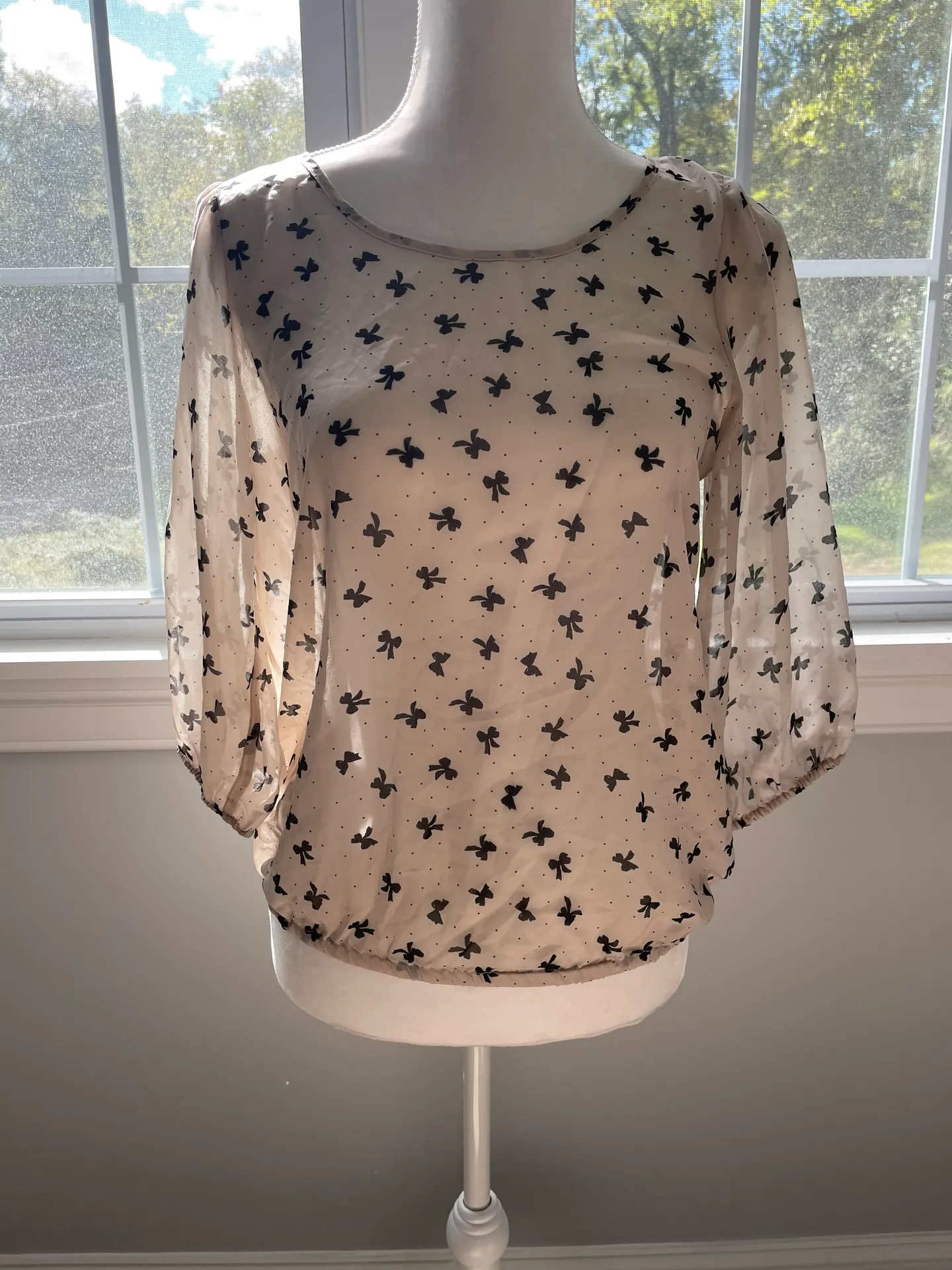 EUC sheer bow blouse - size small. Has elastic waist and arm bands. Perfect too for work. Scoop neck... Show more