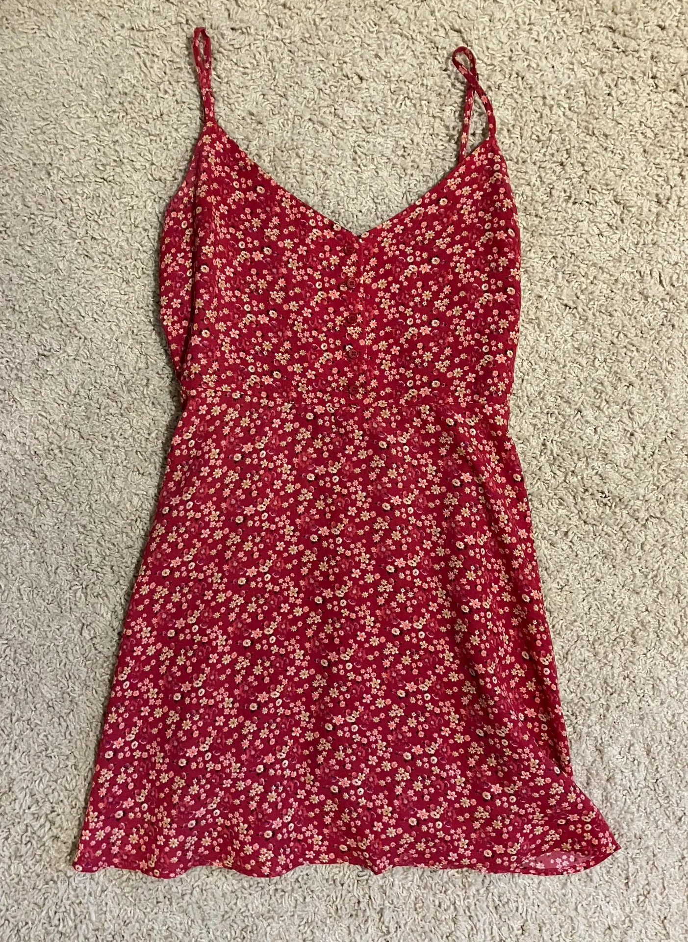 *red floral dress *has adjustable straps *has an extra slip layer *has a few loose threads but othe... Show more