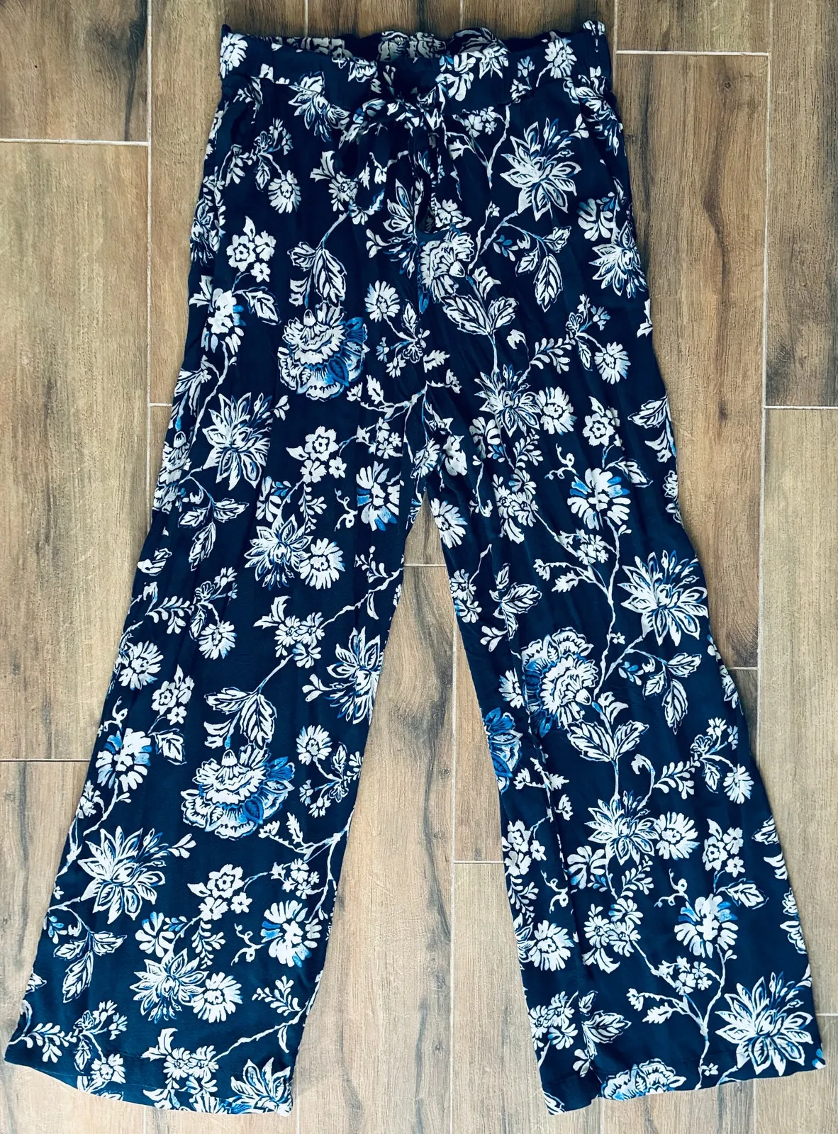 Lightweight viscose pants that are a flowy material with belted tie waist, elastic waist. Floral pri... Show more
