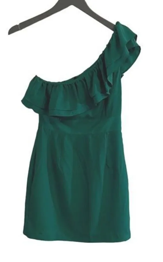 This is such a sweet dress with a ruffled one shoulder. Beautiful shade of green. 100% polyester. Zi... Show more