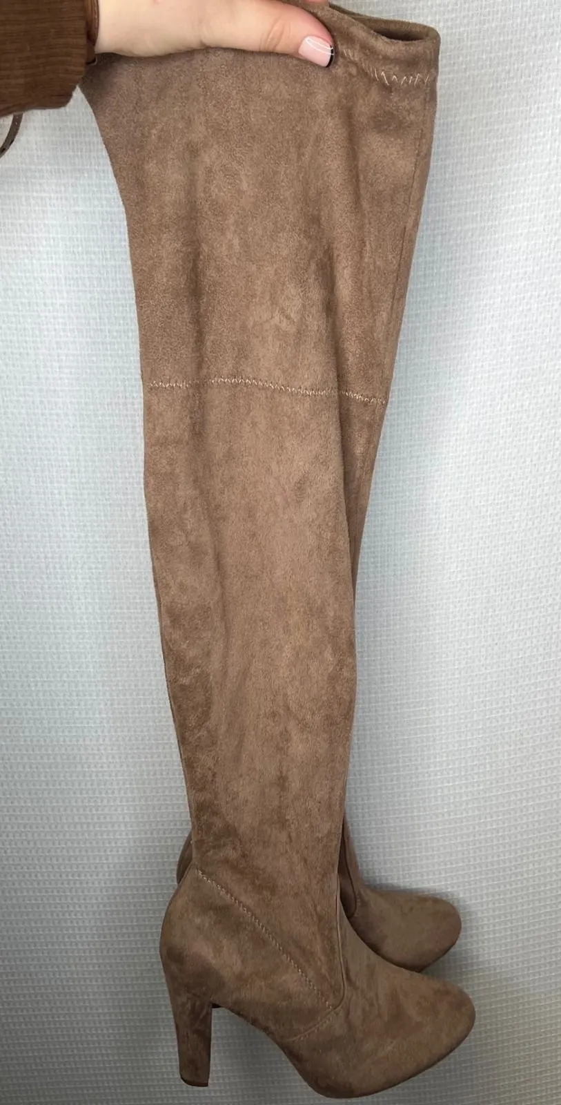 Womens taupe over the knee boots. These boots feature a suede-like texture, a stacked block heel, a... Show more