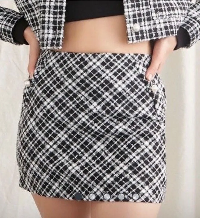 Forever 21 Black/Cream Plaid Tweed Faux Pearl Mini Skirt Juniors YTK Size L Waist 30 Length 16