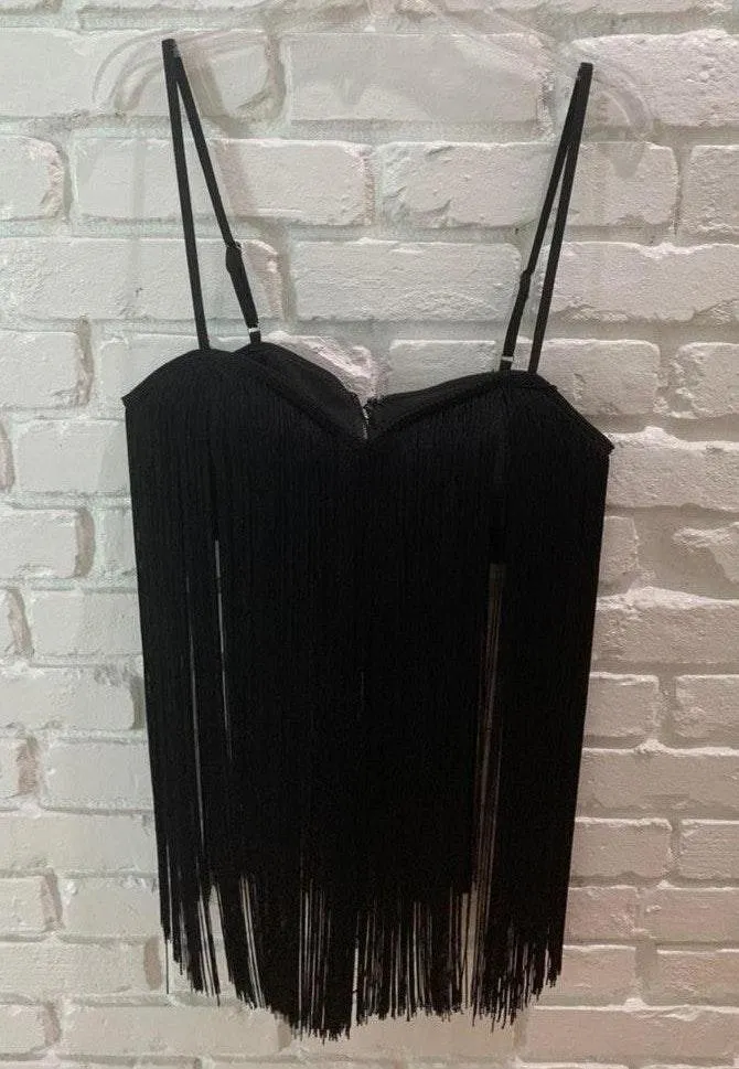 Black fringe string crop top, zipper & clip in the back, padded & underwire, adjustable straps.Repos... Show more