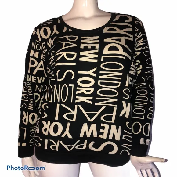 In excellent condition. Black with white lettering. New York, Paris and London graphic print. Crew n... Show more