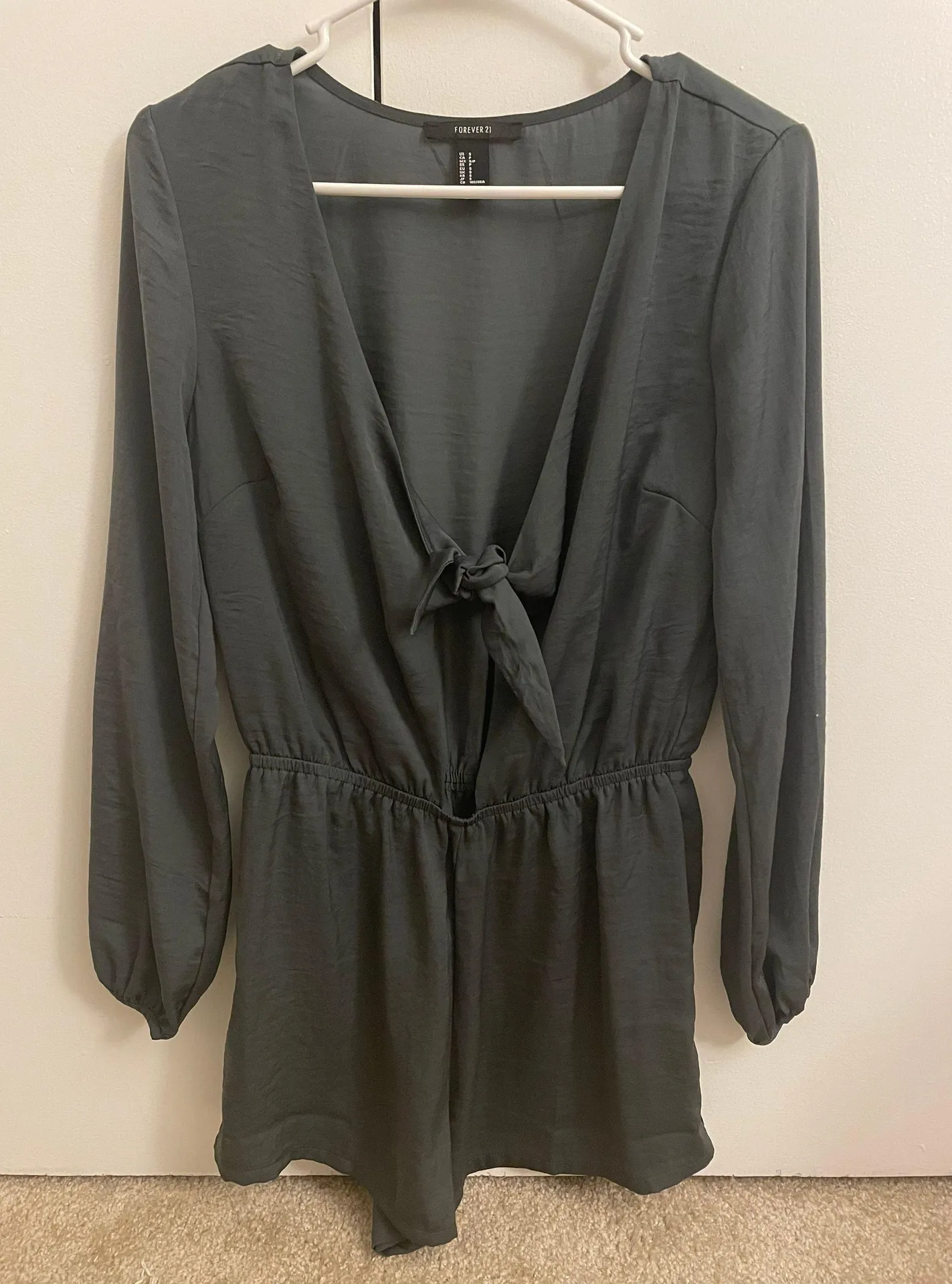 Slate gray long sleeve romper from Forever 21. Deep V with a tie in the middle. Never worn before, t... Show more