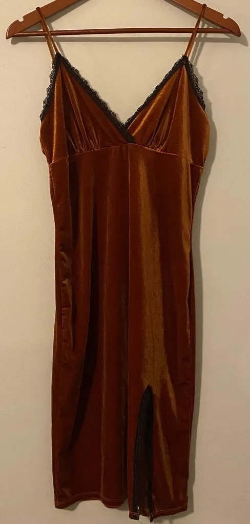 Forever 21 Brown Velvet Slip Dress Medium 90s Y2K Lace Features: Triangle top neckline Black lace a... Show more