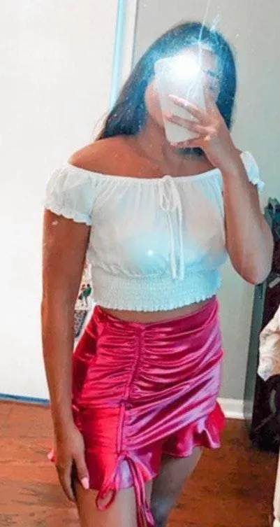 Hot pink satin skirt. Has adjustable tie on the side. Also zips up on the side. Looks like it has so... Show more